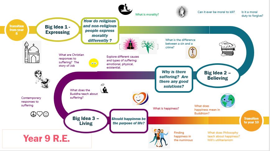 How has the curriculum been designed? The R.E. curriculum has been designed to help students explore cultures and beliefs beyond their individual experiences. The R.E. curriculum offers a broad range of Religions and Themes for students to study. The curriculum in KS3 builds towards further study of the subject at KS4 and links to a diverse range of subjects at KS5 and beyond by mapping a sequence of modules that ensures that prior learning is built on and is reflected on throughout.